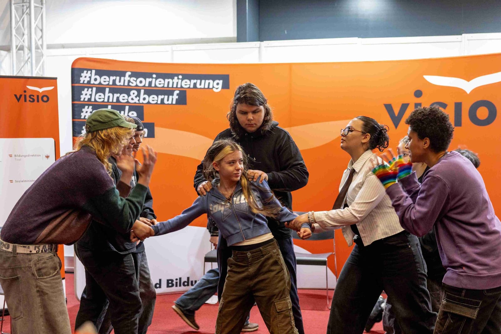 Zwölf Jugendliche vom AusbildungsFit Mils stehen gemeinsam auf der Bühne